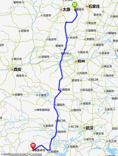 左右,沿途经过阳泉——长治——焦作——南阳——襄阳——荆门——荆州——常德(也可以走国道经澧县、石门县)——慈利——张家界。
